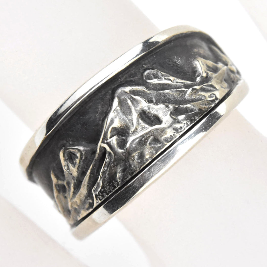 Panoramic mountain range motif rendered in gorgeous realistic detail. Sterling silver in matte finish and light antiquing.