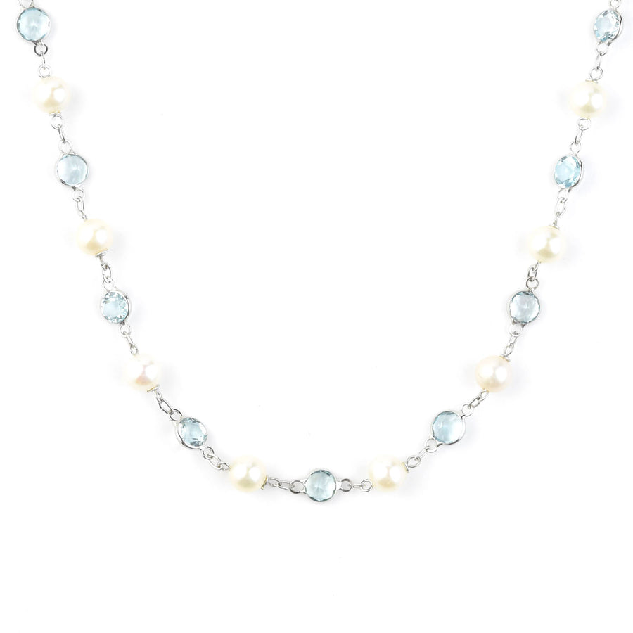 Pearl & Blue Topaz Station Necklace in 14k White Gold