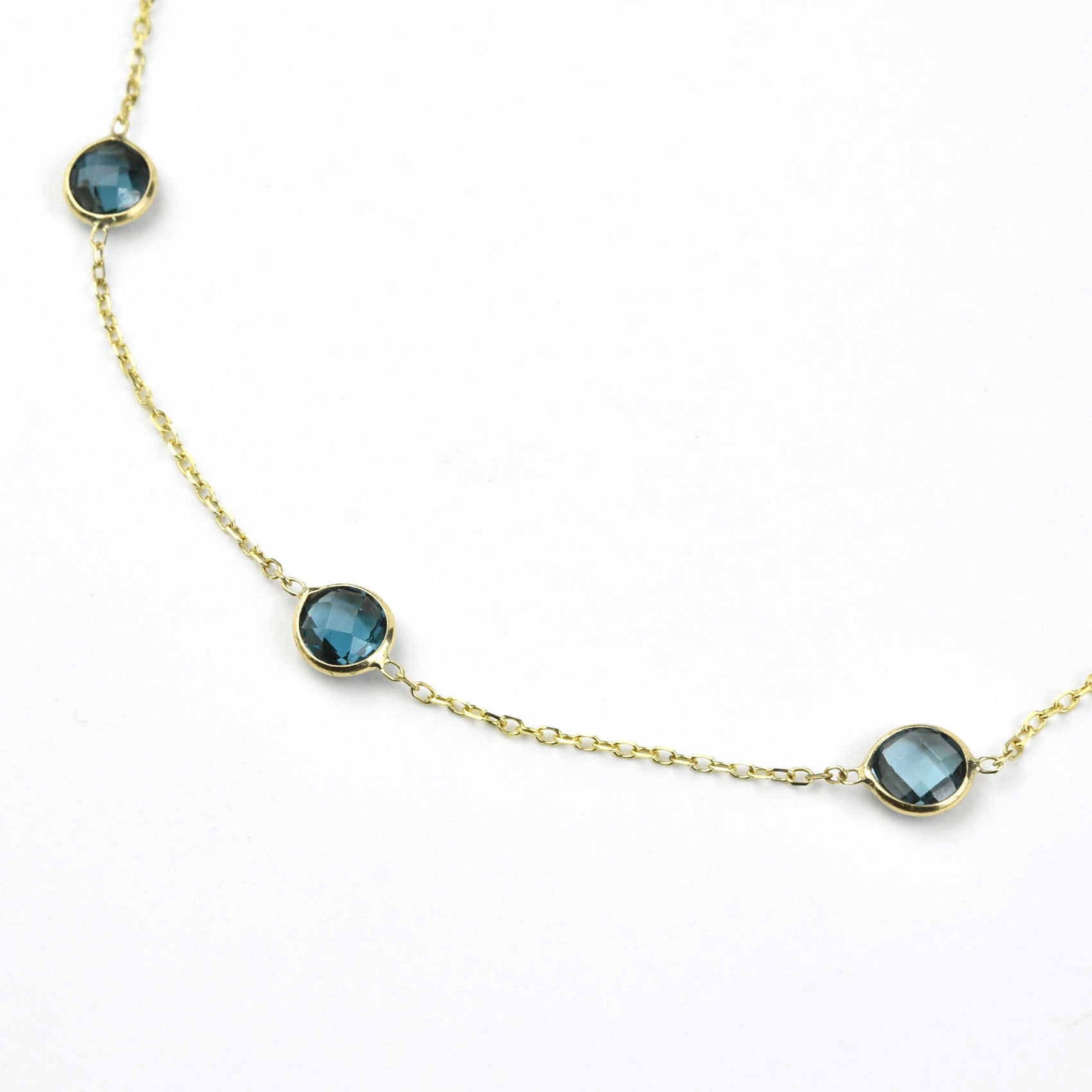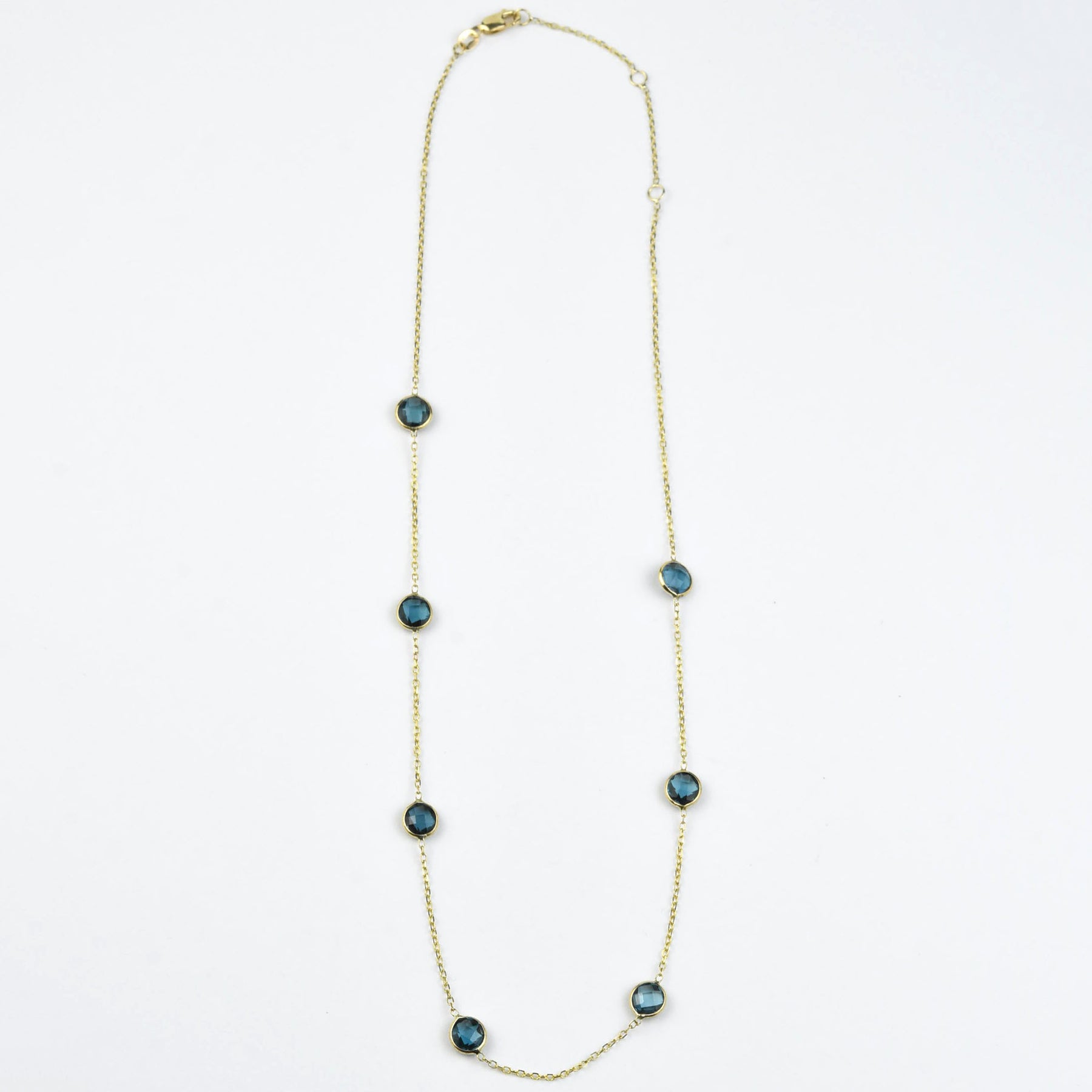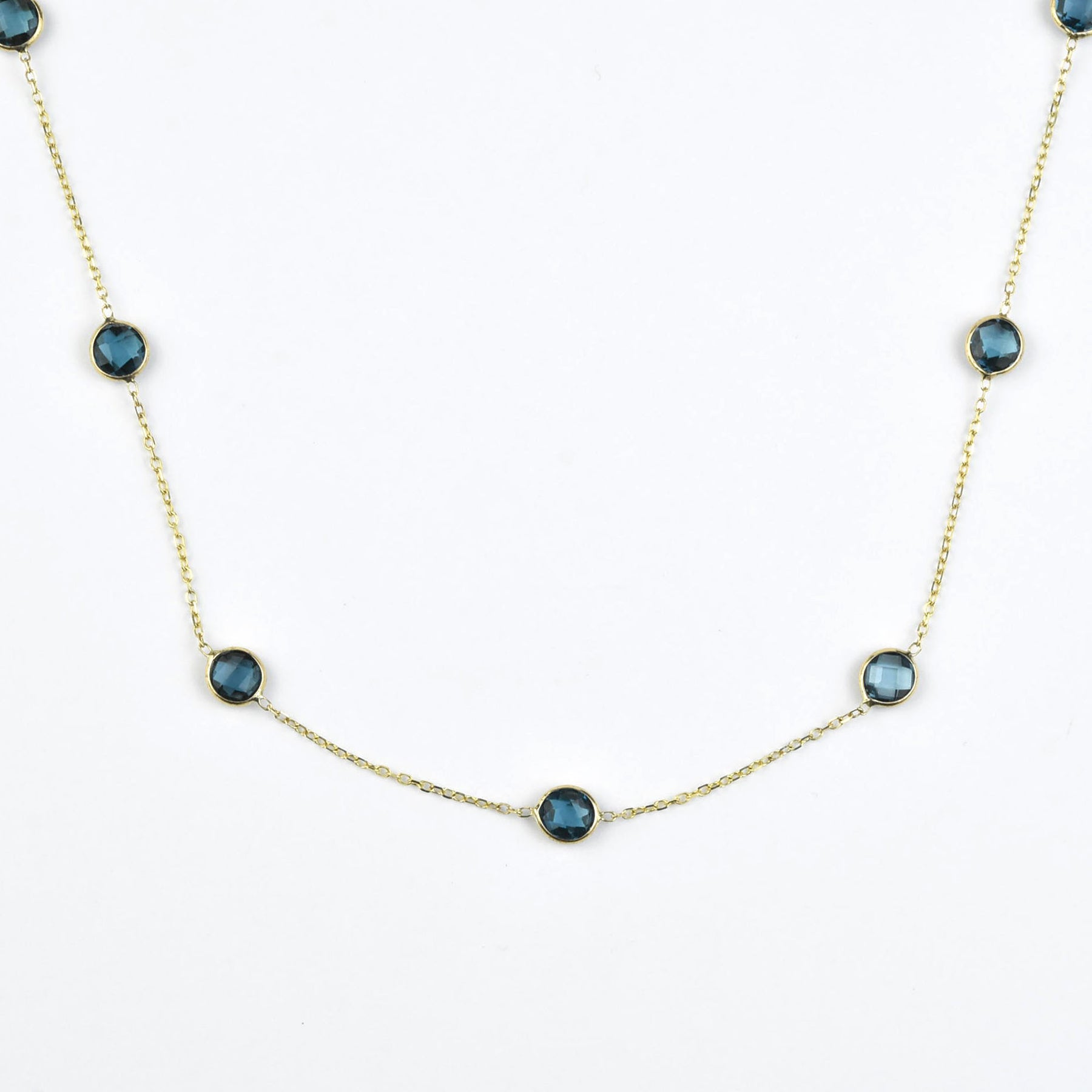 • Seven round checkerboard cut London Blue Topaz stones, each measuring 6.7mm