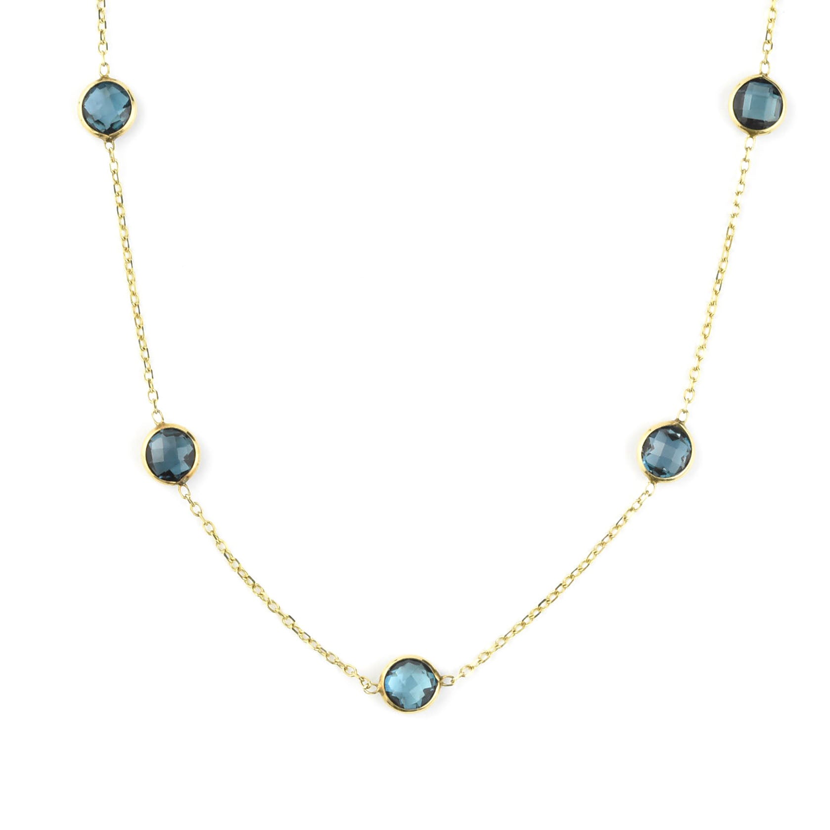 - Seven round checkerboard cut London Blue Topaz stones, each measuring 6.7mm