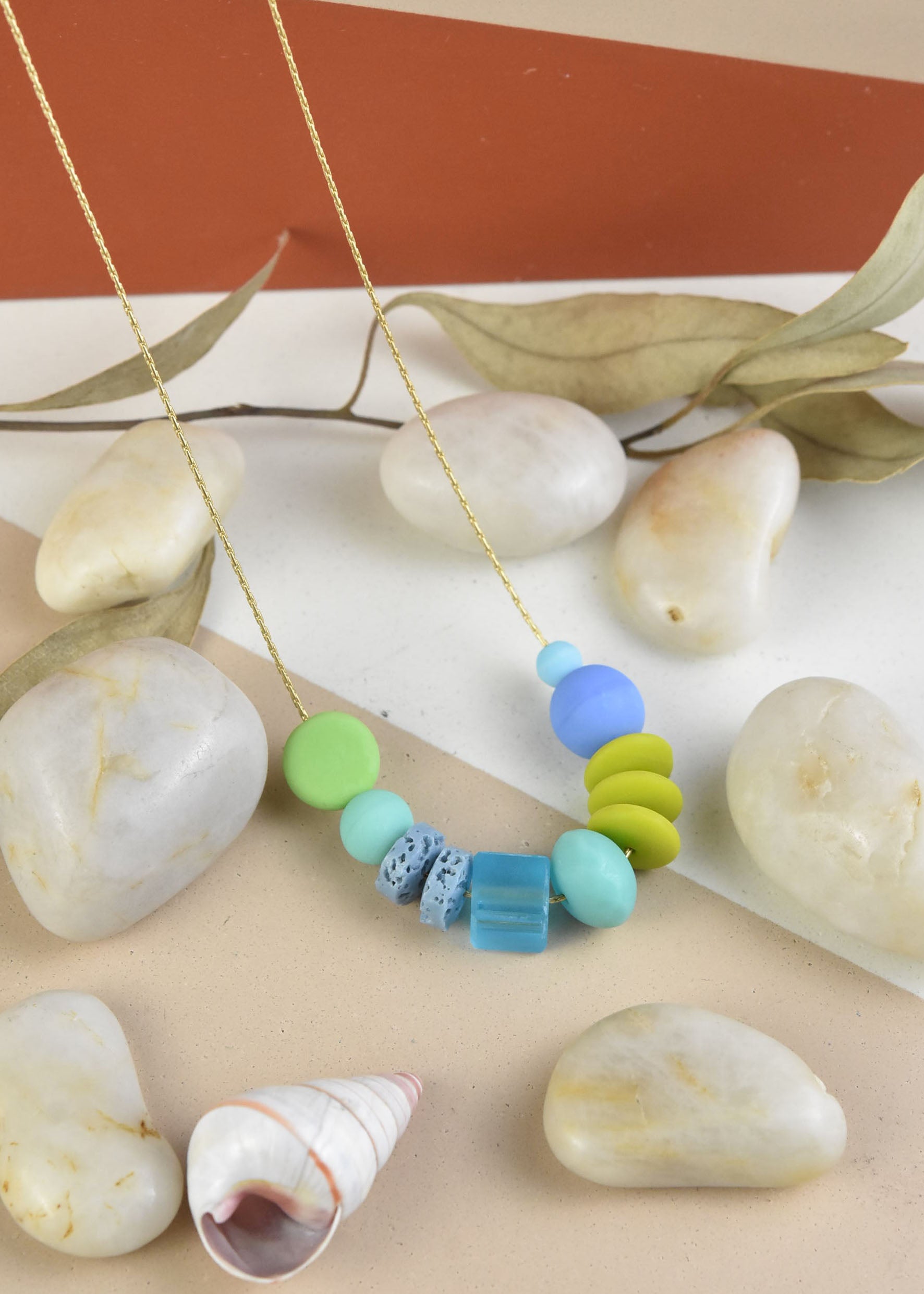 David Aubrey lines vary from delicate, meticulously assembled jewelry of monochromatic hues to larger, more vibrant pieces. Some collections are themed, whether romantic, vintage, tribal, or art deco. Each piece is painstakingly crafted with an array of raw materials, including plated and oxidized brass and white metal, semiprecious stones, vintage glass beads, Indian handmade glass beads, acrylic, and carved bone.