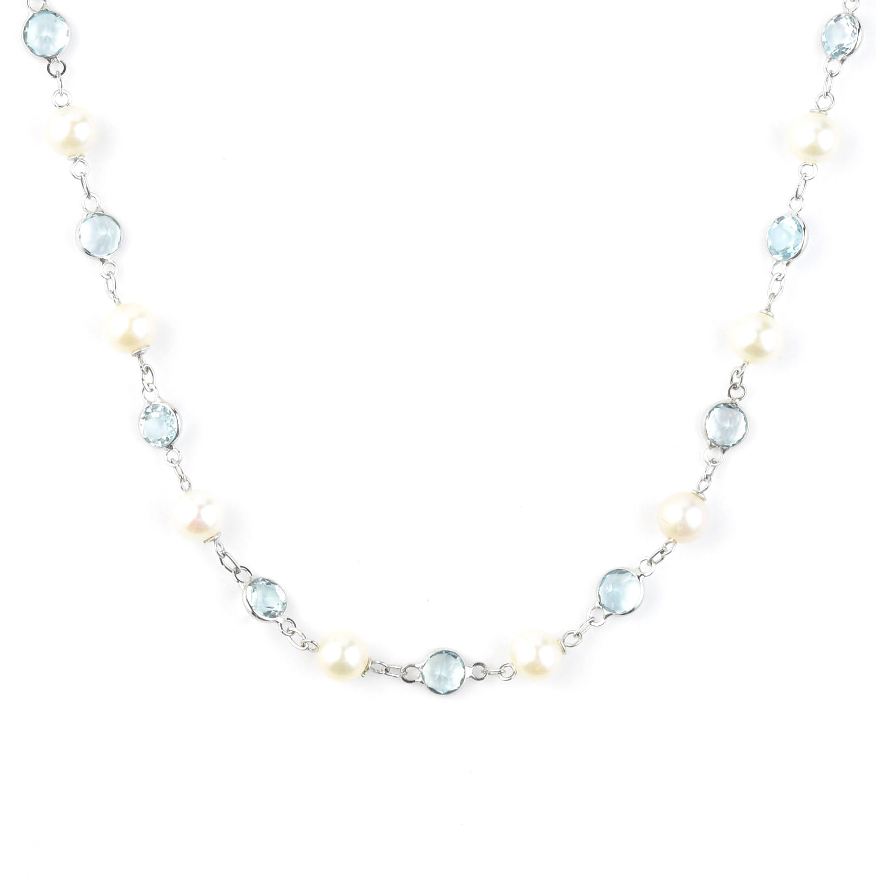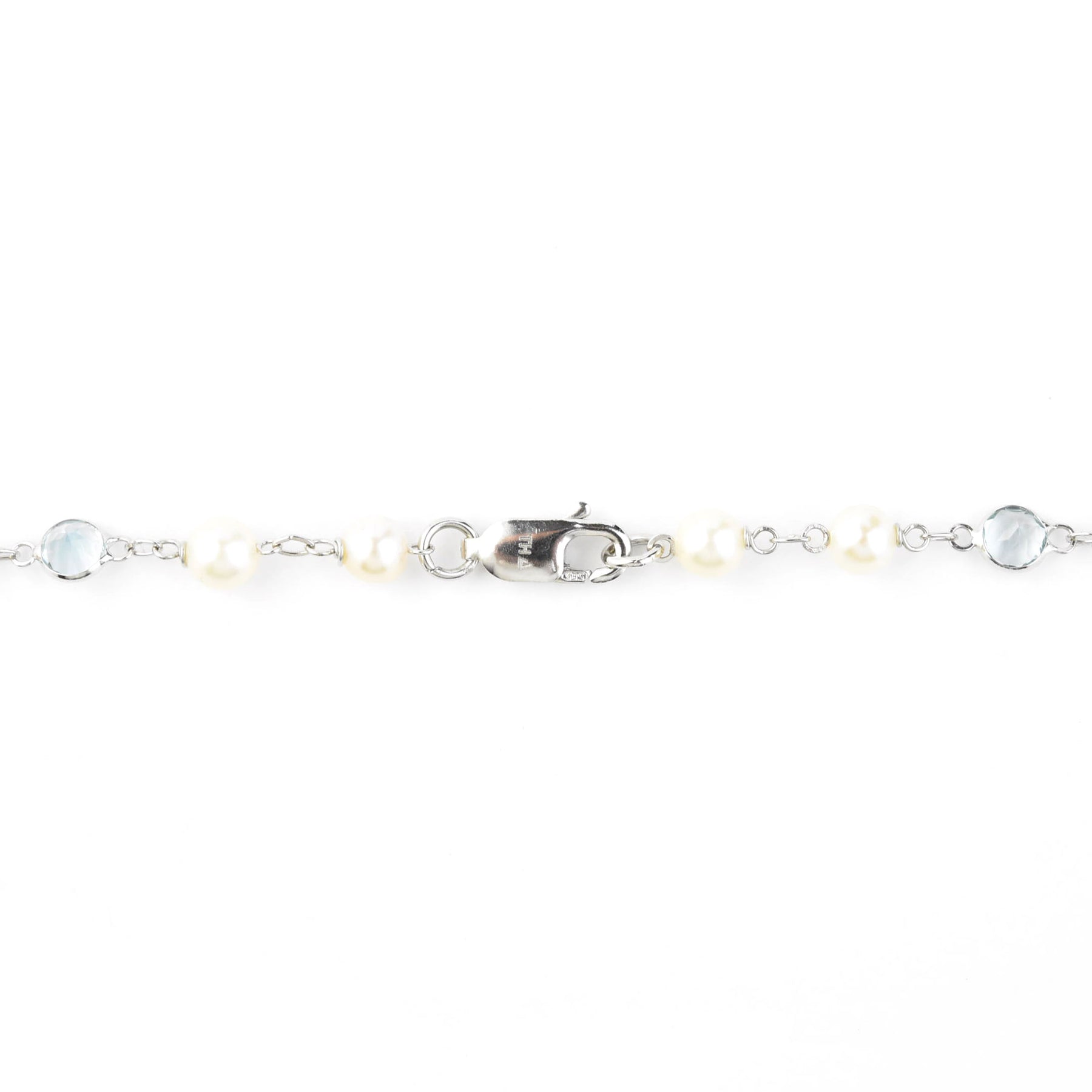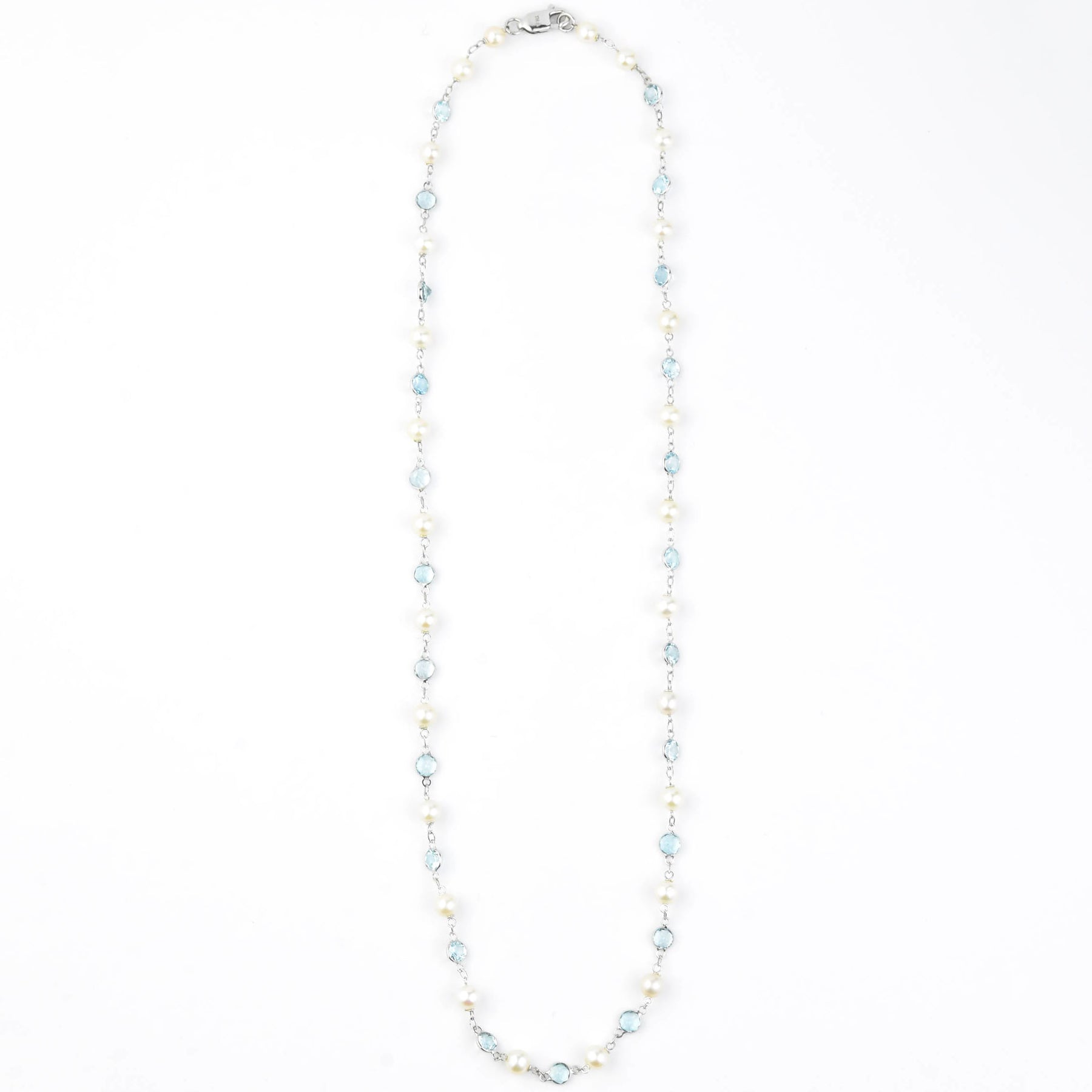 Pearl & Blue Topaz Station Necklace in 14k White Gold