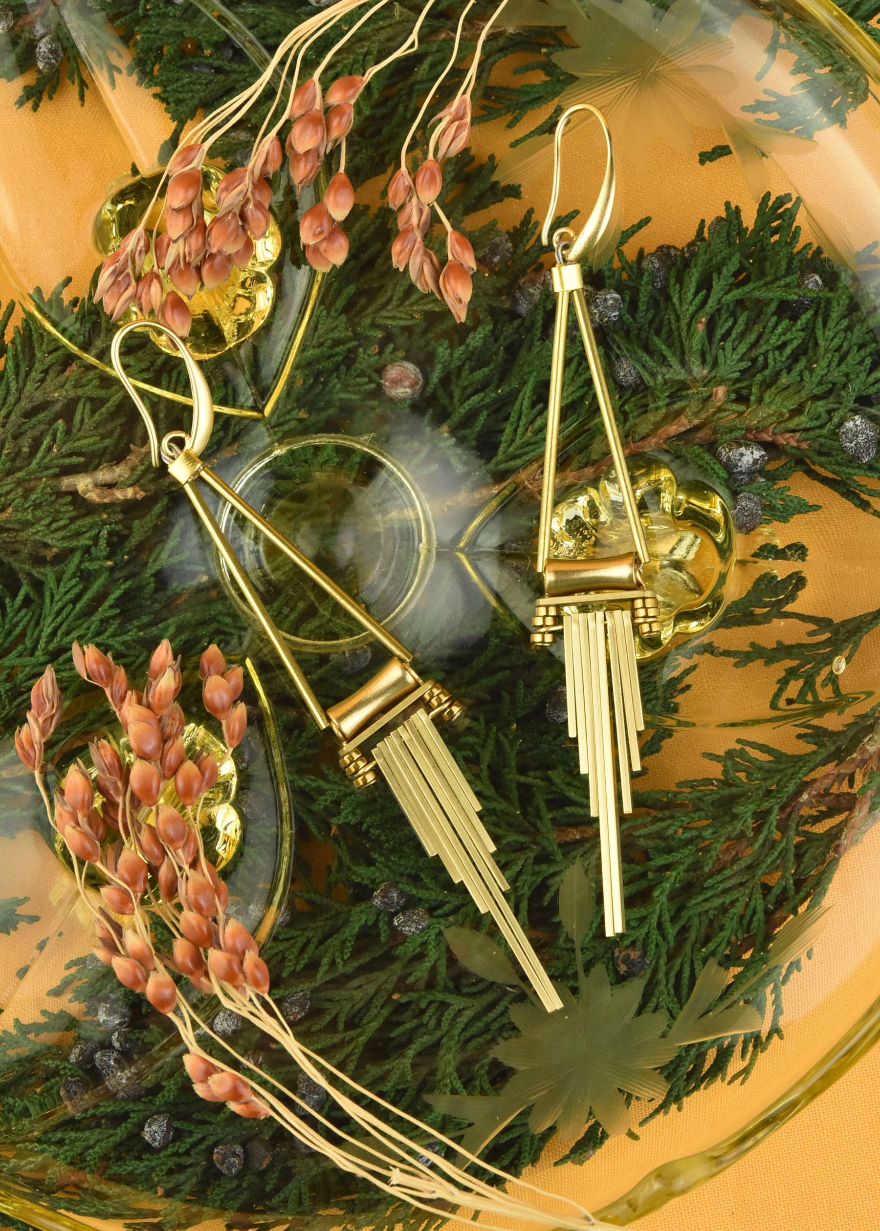 David Aubrey lines vary from delicate, meticulously assembled jewelry of monochromatic hues to larger, more vibrant pieces. Some collections are themed, whether romantic, vintage, tribal, or art deco. Each piece is painstakingly crafted with an array of raw materials, including plated and oxidized brass and white metal, semiprecious stones, vintage glass beads, Indian handmade glass beads, acrylic, and carved bone.