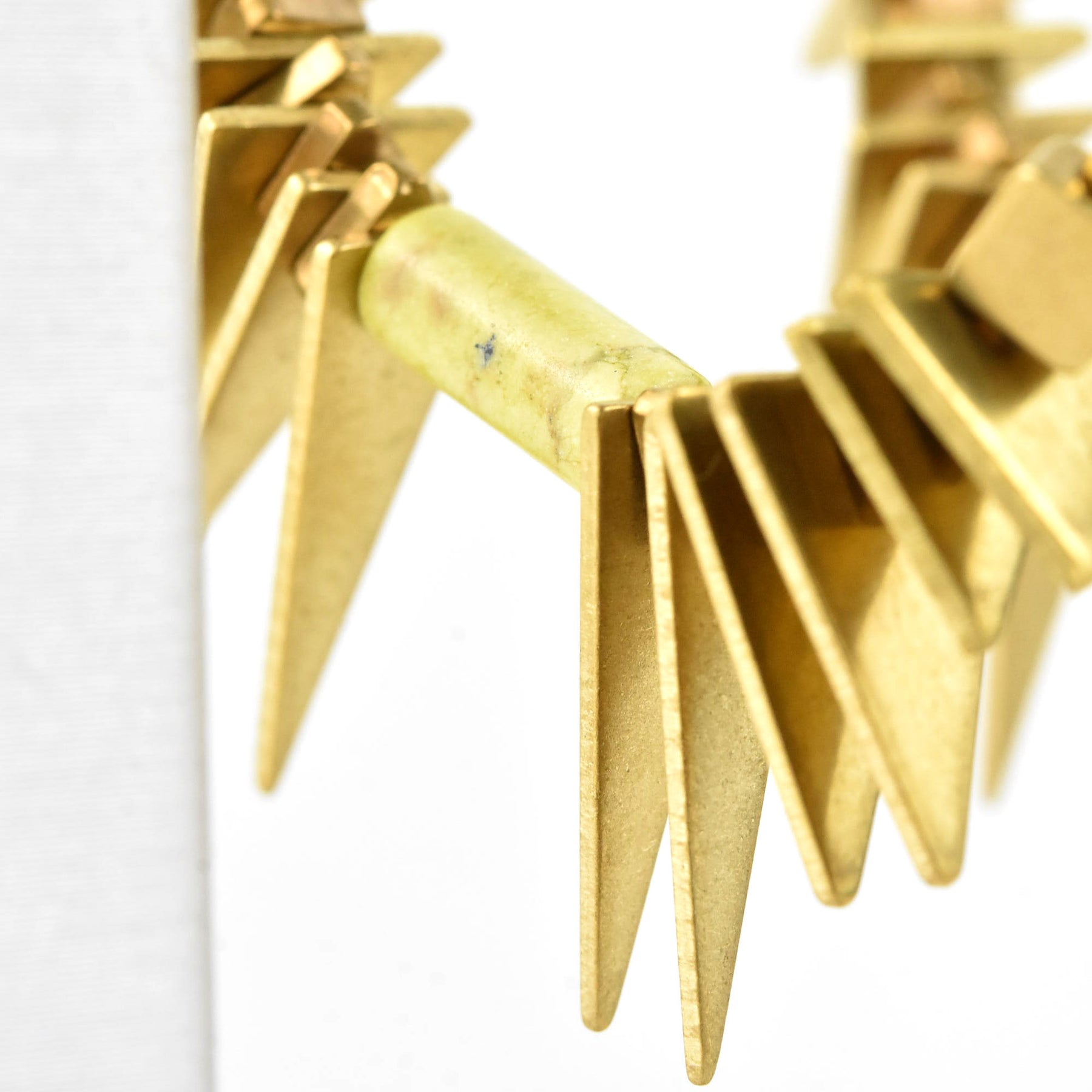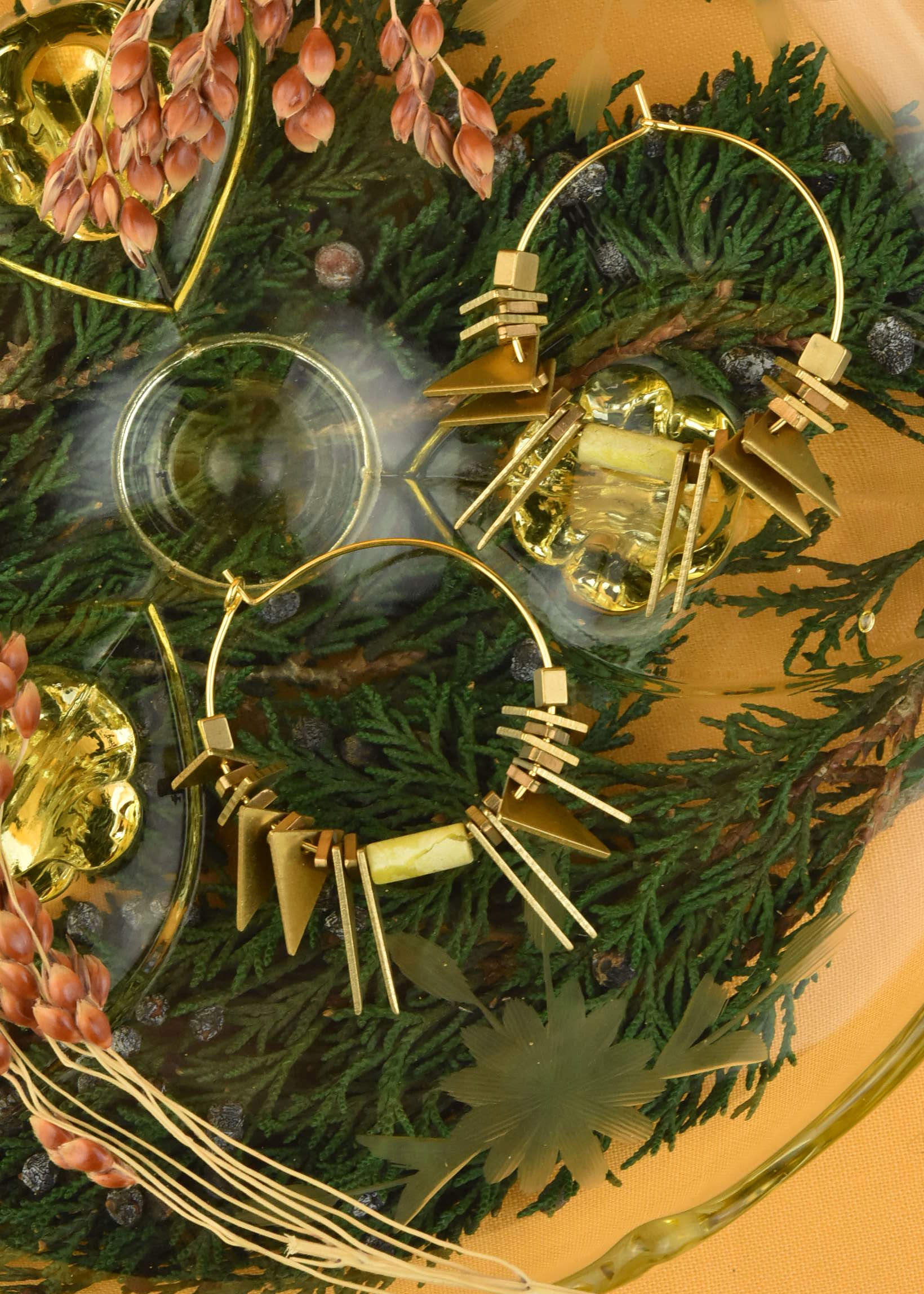 David Aubrey lines vary from delicate, meticulously assembled jewelry of monochromatic hues to larger, more vibrant pieces. Some collections are themed, whether romantic, vintage, tribal, or art deco. Each piece is painstakingly crafted with an array of raw materials, including plated and oxidized brass and white metal, semiprecious stones, vintage glass beads, Indian handmade glass beads, acrylic, and carved bone.