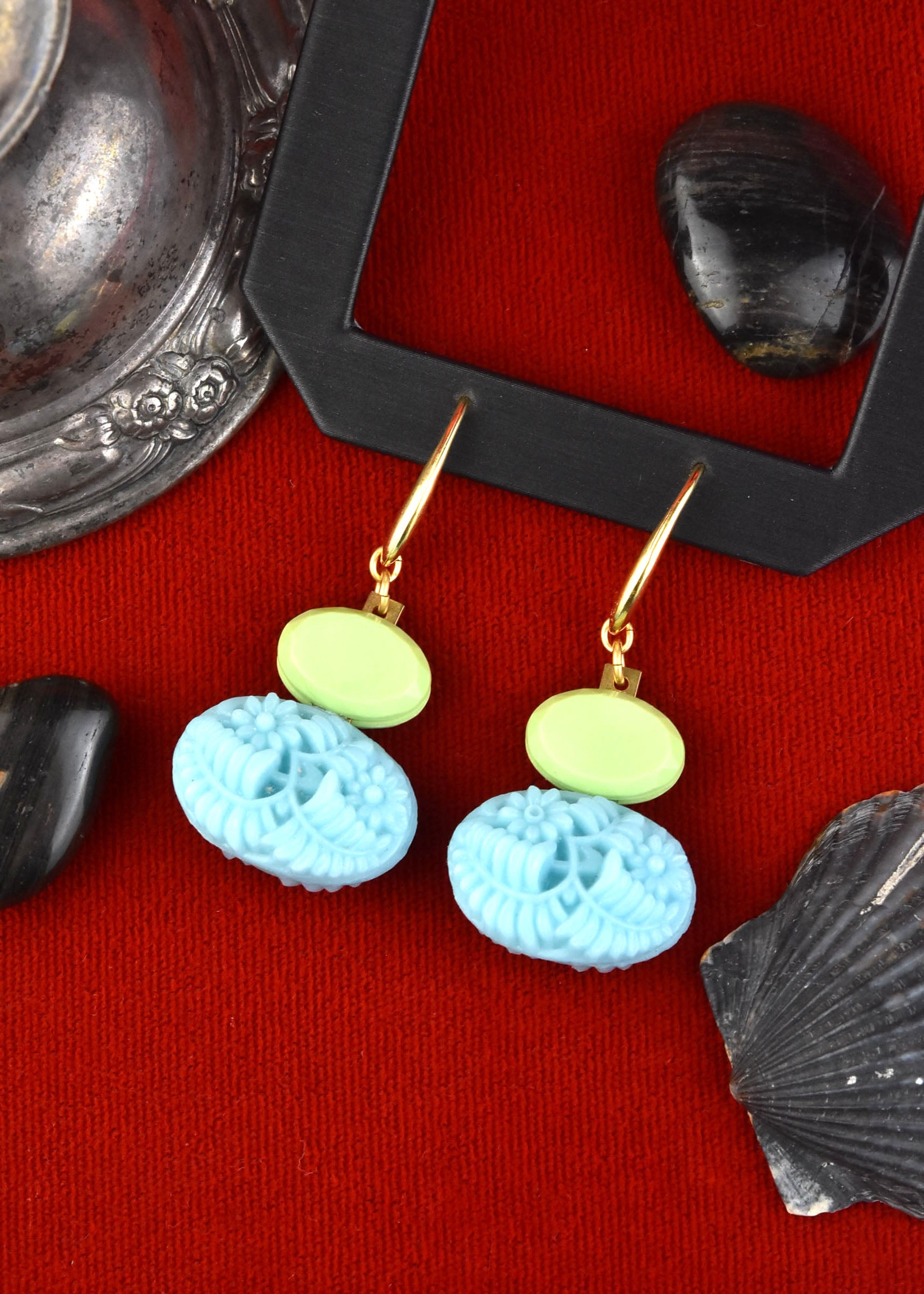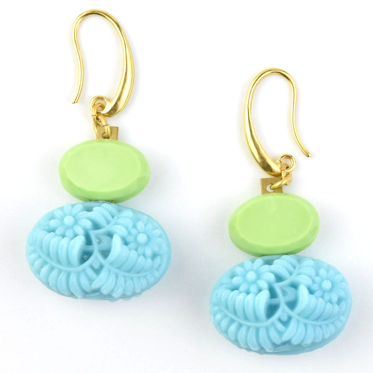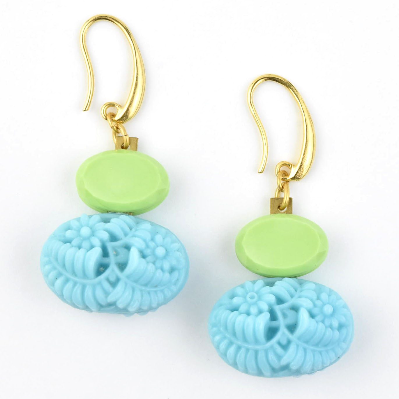 David Aubrey lines vary from delicate, meticulously assembled jewelry of monochromatic hues to larger, more vibrant pieces. Some collections are themed, whether romantic, vintage, tribal, or art deco. Each piece is painstakingly crafted with an array of raw materials, including plated and oxidized brass and white metal, semiprecious stones, vintage glass beads, Indian handmade glass beads, acrylic, and carved bone.